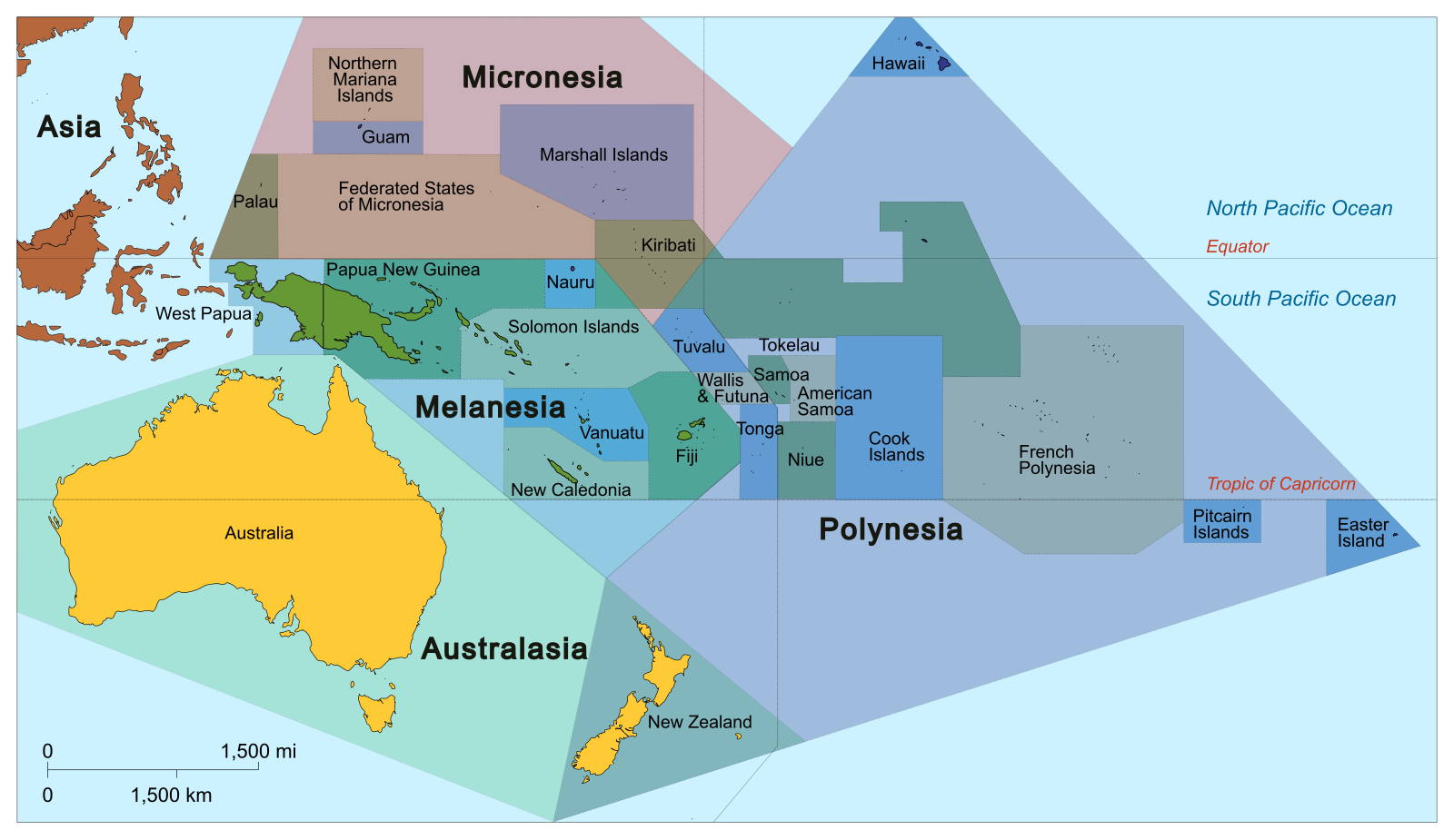 The following map shows the 4 components of Oceania - Australasia, Polynesia, Melanesia, and Micronesia.