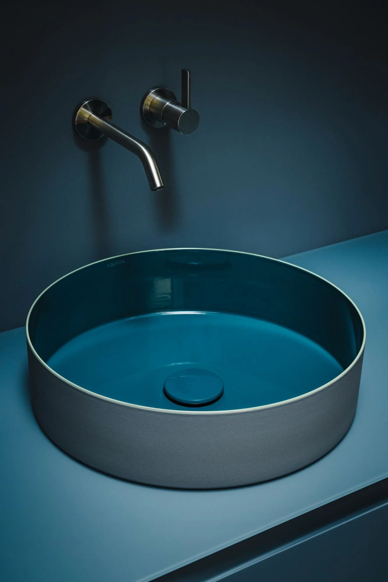 The TRI-COLOR basin demonstrates Vitreon steel’s chromatic versatility alongside ARUN furniture and Kartell LAUFEN fittings. Photo credits © LAUFEN