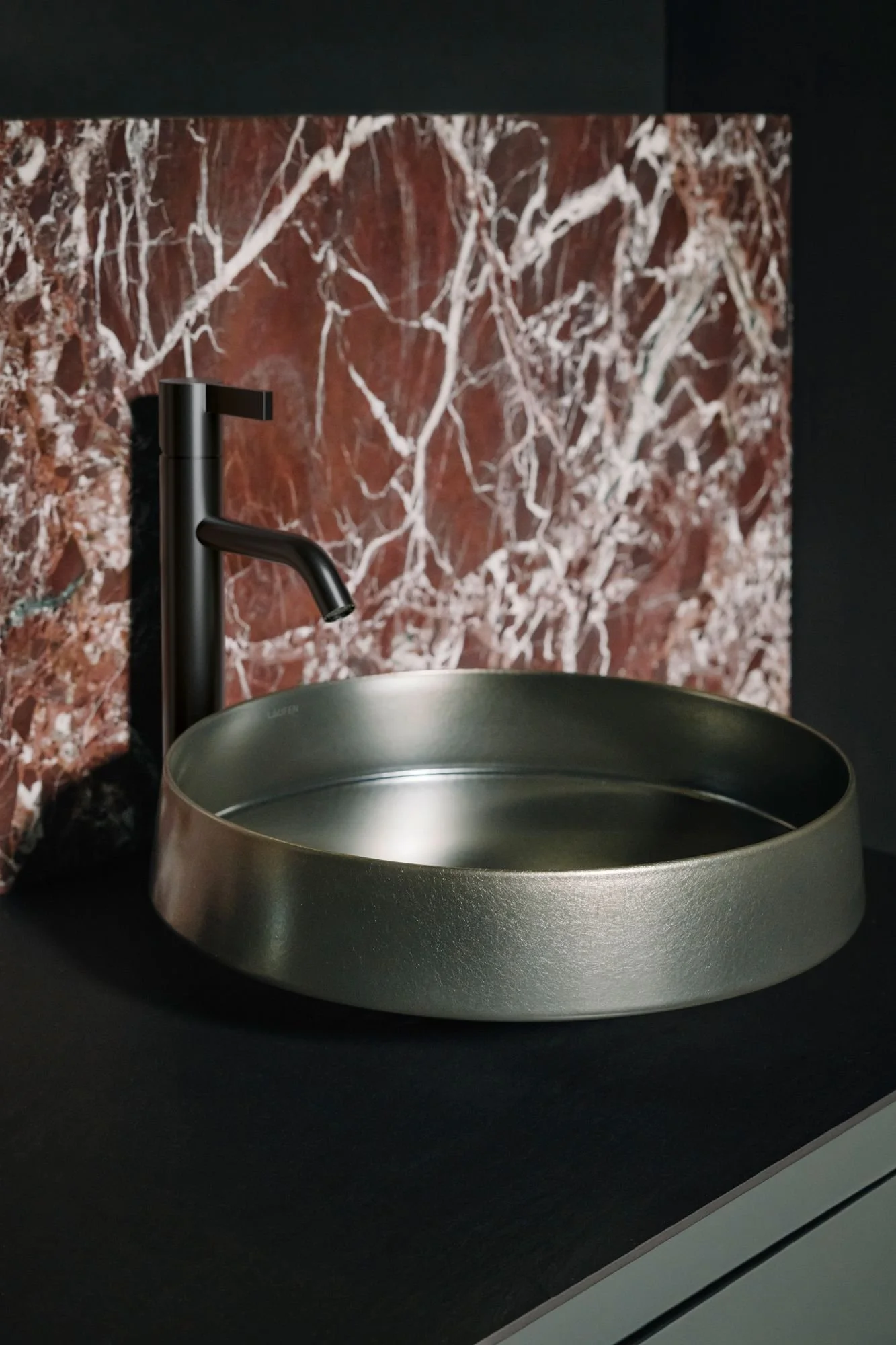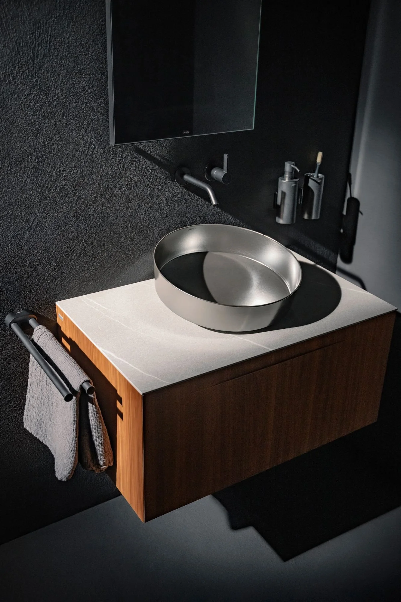 The premium wash area as a composition of material, form and colour. Washbasin NIB in Dark Iron with ARUN vanity and Kartell LAUFEN faucet. Photo credits © LAUFEN